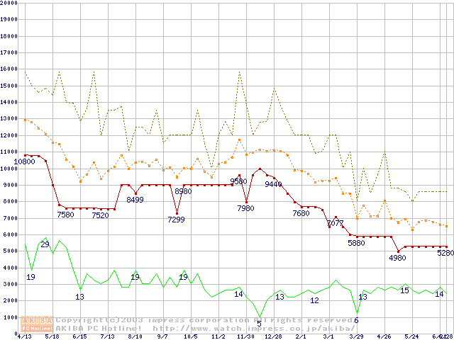 メモリ主要製品(最安値5千円~1万円未満)の最安値推移