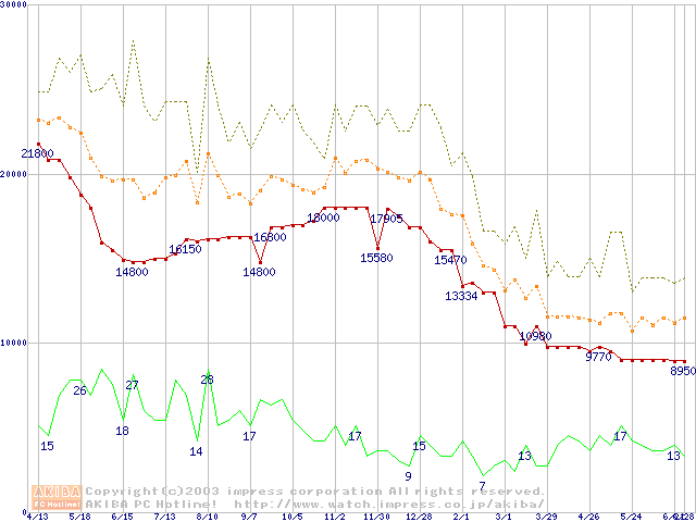 PC2100(DDR266) DDR SDRAM DIMM ECC対応 Registeredタイプの最安値推移