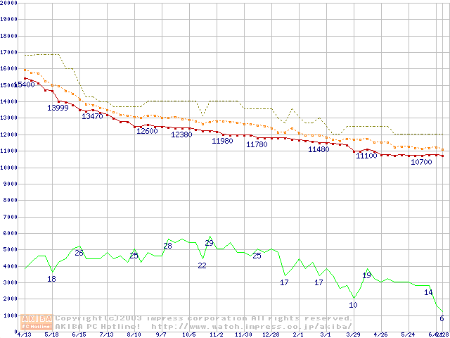 Travelstar 40GN (9.5mm,4200rpm,UltraATA/100,2MB,FDB,20GB/Platter)の最安値推移