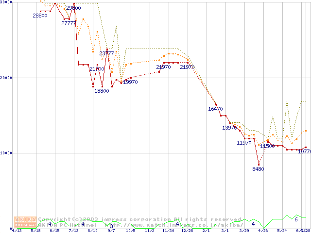 PC2700(DDR333) DDR SDRAM DIMM ECC対応 Registeredタイプの最安値推移