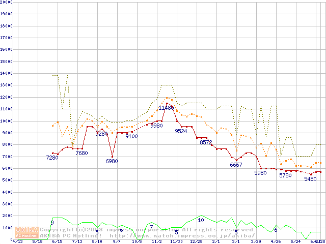 PC2100(DDR266) DDR SDRAM DIMM(CL 2.0) ECC対応 Registeredタイプの最安値推移