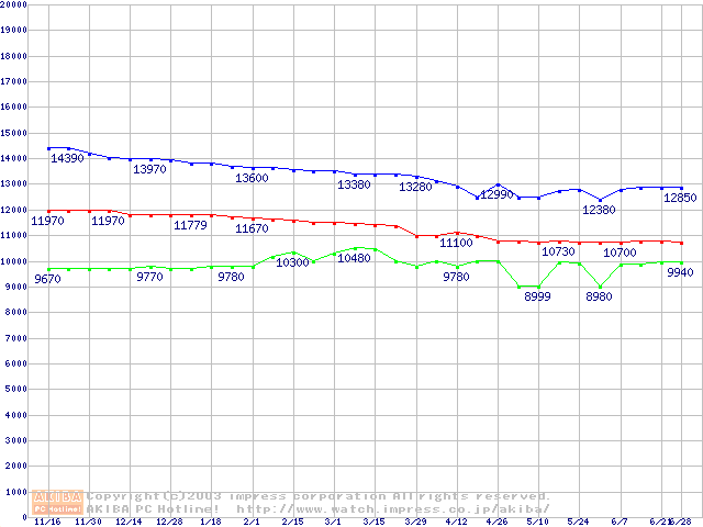 | [↑前グラフ]: | Travelstar 80GN (9.5mm,4200rpm,UltraATA/100,2MB,FDB,40GB/Platter)の最安値推移 |