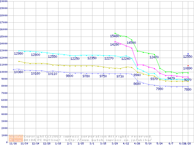 | [↑前グラフ]: | Socket 603 (micro-PGA,FSB 400MHz,L2 512KB,Prestonia)の最安値推移 |