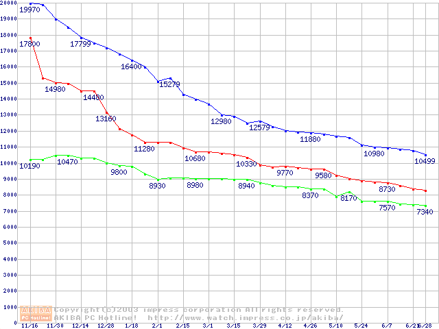 | [↑前グラフ]: | Deskstar 180GXP (7200rpm,8MB,UltraATA/100,FDB)の最安値推移 |
