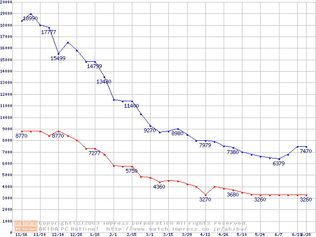 PC3200(DDR400) DDR SDRAM DIMMの最安値推移