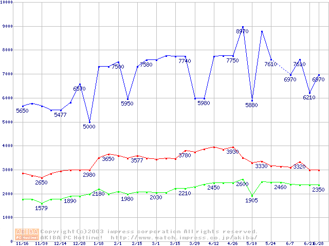 | [↓次グラフ]: | PC100 SDRAM DIMM CasLatency=2 ECC対応の最安値推移 |