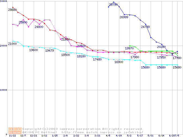 | [↓次グラフ]: | 2.5インチHDD主要製品(最安値2万円~3万円未満)の最安値推移 |