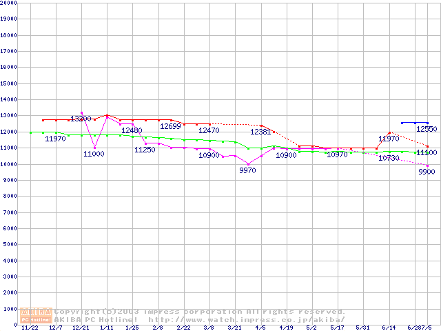 | [↑前グラフ]: | 2.5インチHDD 20GB~30GB未満(9.5mm厚)の最安値推移 |