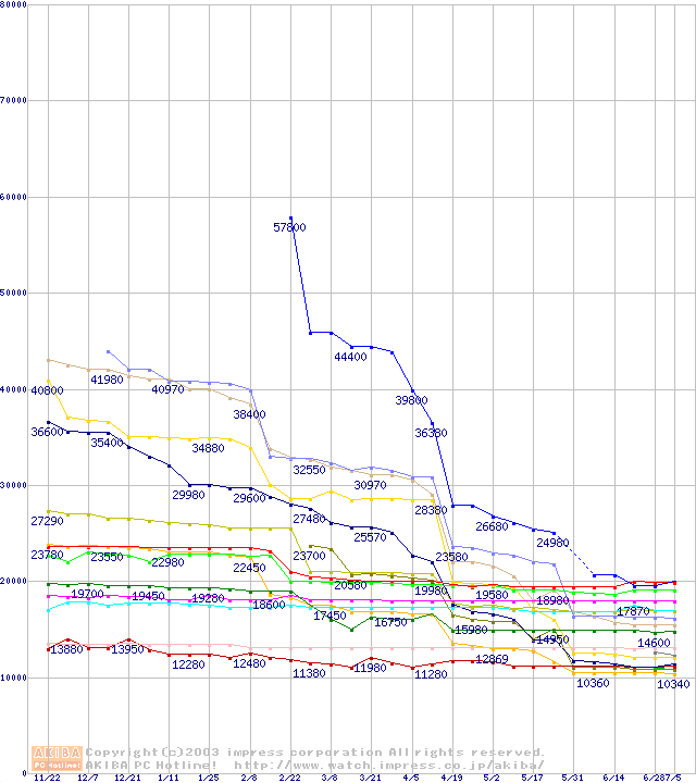 CPU主要製品(最安値1万円~2万円未満)の最安値推移