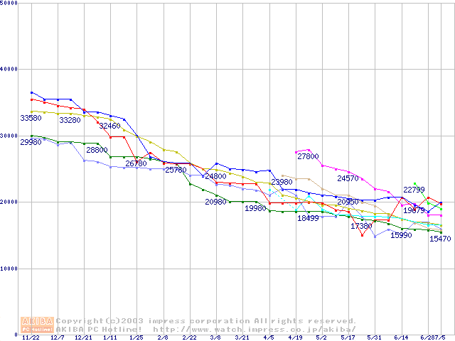 | [↓次グラフ]: | HDD主要製品(最安値2万円以上)の最安値推移 |