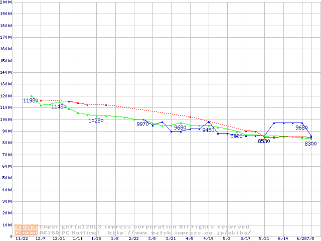 | [↓次グラフ]: | HDD 100GB以上(5400rpmクラス)の最安値推移 |