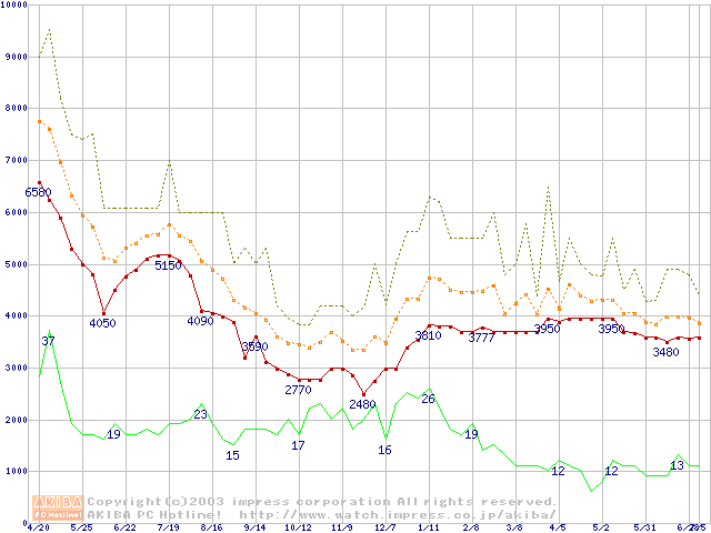 PC133 SDRAM DIMM CasLatency=2の最安値推移