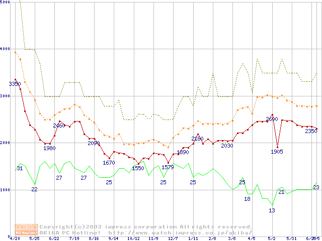 PC100 SDRAM DIMM CasLatency=2の最安値推移