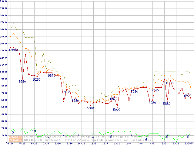 PC100 SDRAM DIMM CasLatency=2の最安値推移