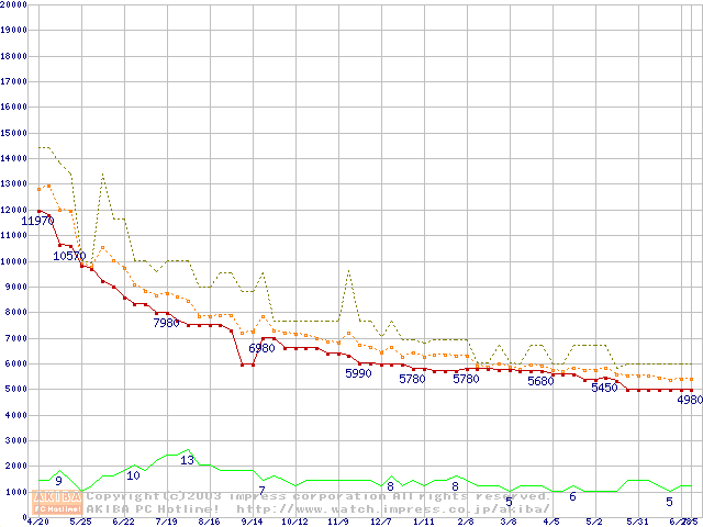 Socket A (PGA,FSB 266MHz,L2 256KB,Thunderbird)の最安値推移