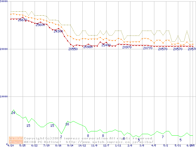 Socket 370 (FC-PGA2,FSB 133MHz,L2 512KB,Tualatin)の最安値推移