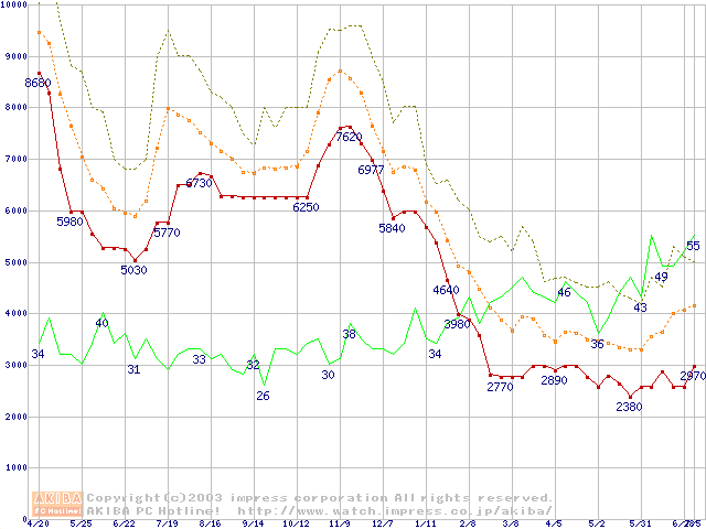 PC2700(DDR333) DDR SDRAM DIMMの最安値推移
