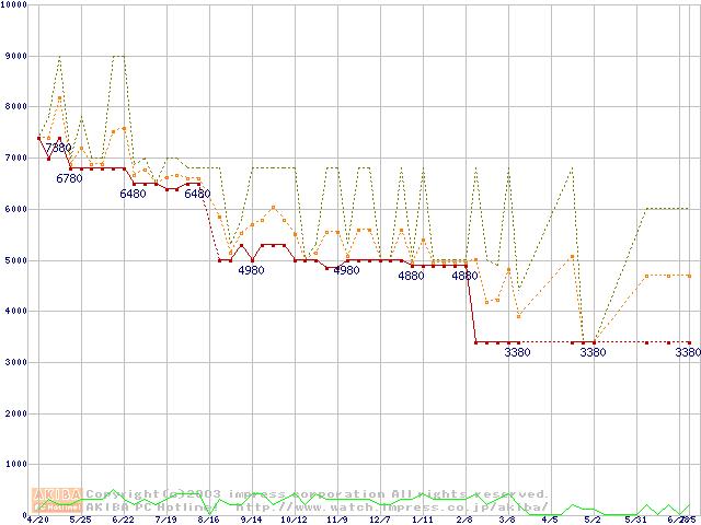 Socket 370 (PGA,FSB 100MHz,L2 64KB,Ezra)の最安値推移
