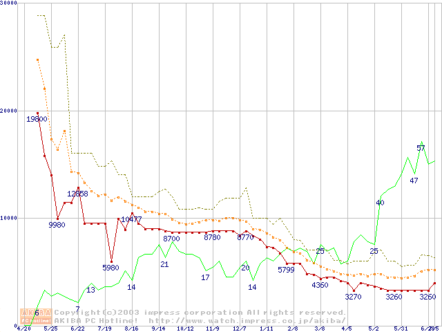 PC3200(DDR400) DDR SDRAM DIMMの最安値推移
