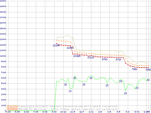 Socket 478 (micro-PGA,FSB 400MHz,L2 128KB,Northwood)の最安値推移