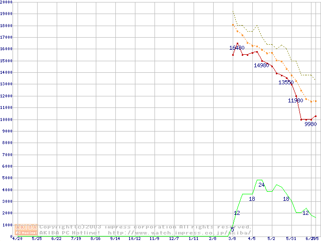 HDD主要製品(最安値1万円~1万5千円未満)の最安値推移