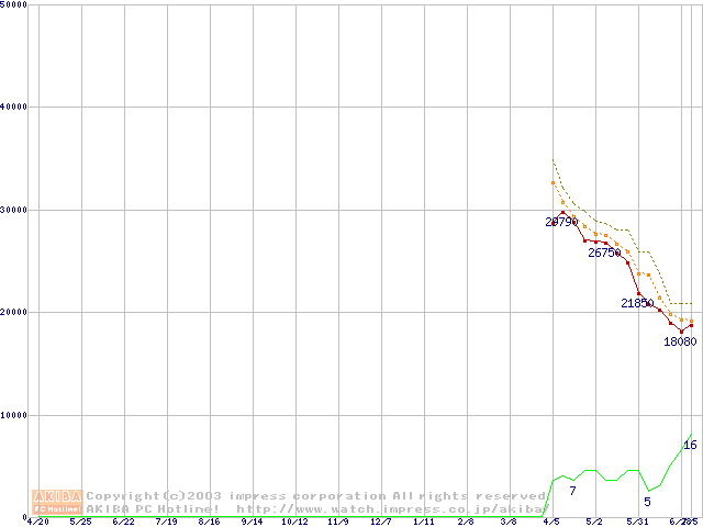Travelstar 80GN (9.5mm,4200rpm,UltraATA/100,8MB,FDB,40GB/Platter)の最安値推移