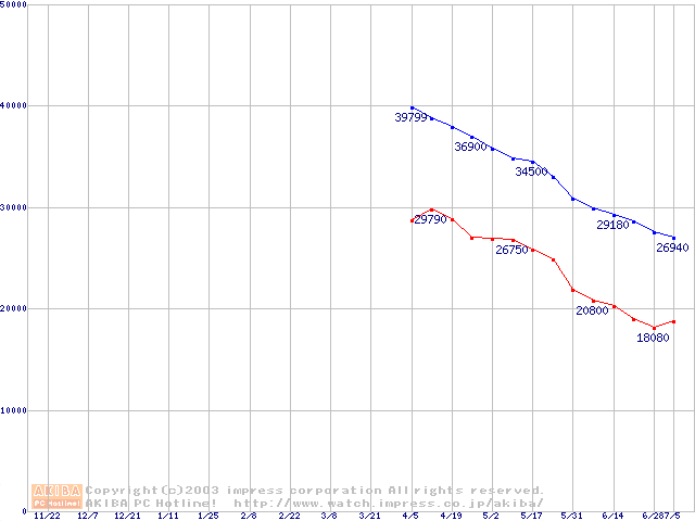 | [↑前グラフ]: | Travelstar DK23EB (9.5mm,5400rpm,UltraATA/100,512KB)の最安値推移 |