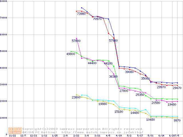 | [↓次グラフ]: | Socket A (OPGA,FSB 333MHz,L2 256KB,Thoroughbred)の最安値推移 |