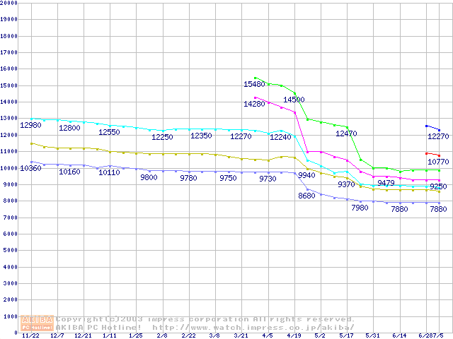 | [↑前グラフ]: | Socket 603 (micro-PGA,FSB 400MHz,L2 512KB,Prestonia)の最安値推移 |