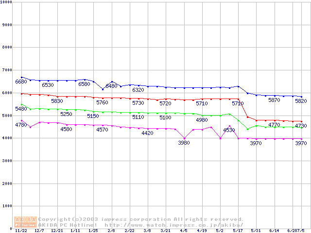 | [↑前グラフ]: | Socket 370 (FC-PGA,FSB 133MHz,L2 256KB,Coppermine)の最安値推移 |