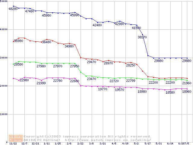 | [↑前グラフ]: | Socket 478 (micro-PGA,FSB 533MHz,L2 512KB,Hyper-Threading,Northwood)の最安値推移 |