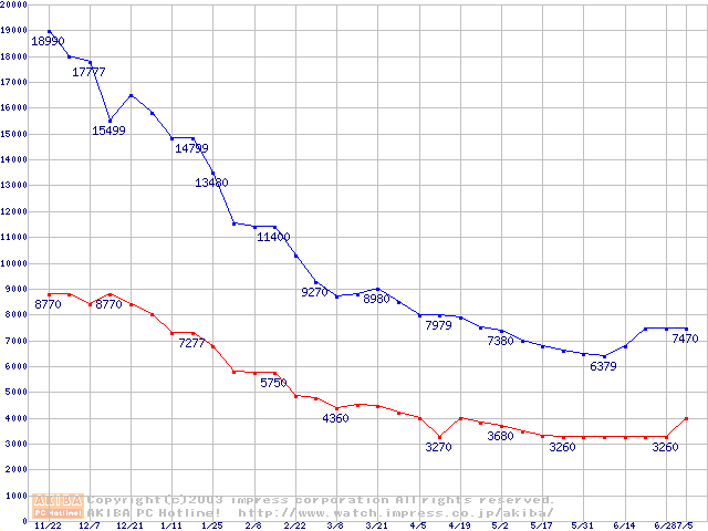 PC3200(DDR400) DDR SDRAM DIMMの最安値推移