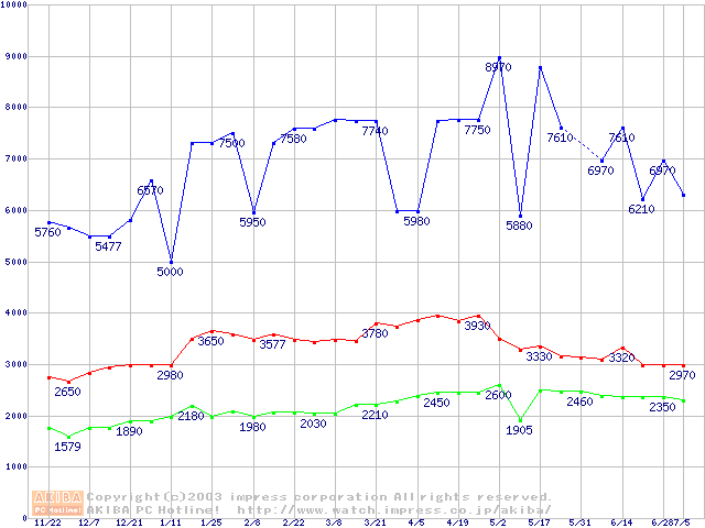 | [↑前グラフ]: | PC133 SDRAM DIMM CasLatency=3 ECC対応 Registeredタイプの最安値推移 |