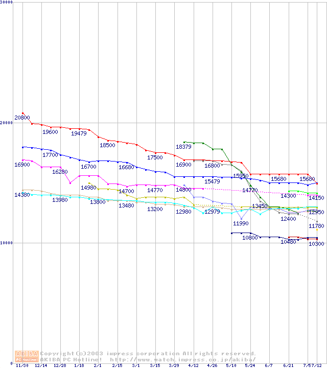 2.5インチHDD主要製品(最安値1万円~1万5千円未満)の最安値推移