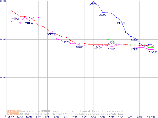 | [↓次グラフ]: | 2.5インチHDD主要製品(最安値2万円~3万円未満)の最安値推移 |