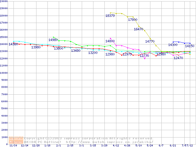 | [↑前グラフ]: | 2.5インチHDD 30GB~40GB未満(9.5mm厚)の最安値推移 |