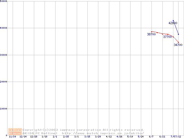 | [↑前グラフ]: | 2.5インチHDD 40GB~50GB未満(9.5mm厚,5400rpm)の最安値推移 |