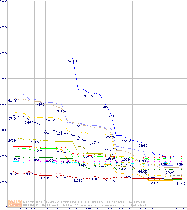 CPU主要製品(最安値1万円~2万円未満)の最安値推移