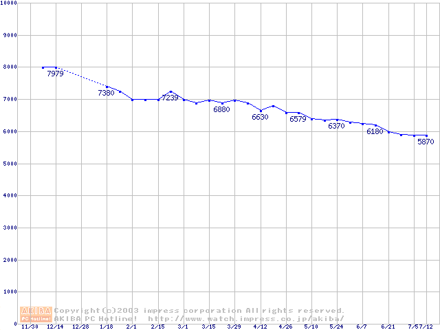 | [↑前グラフ]: | HDD 20GB~30GB未満(5400rpmクラス)の最安値推移 |