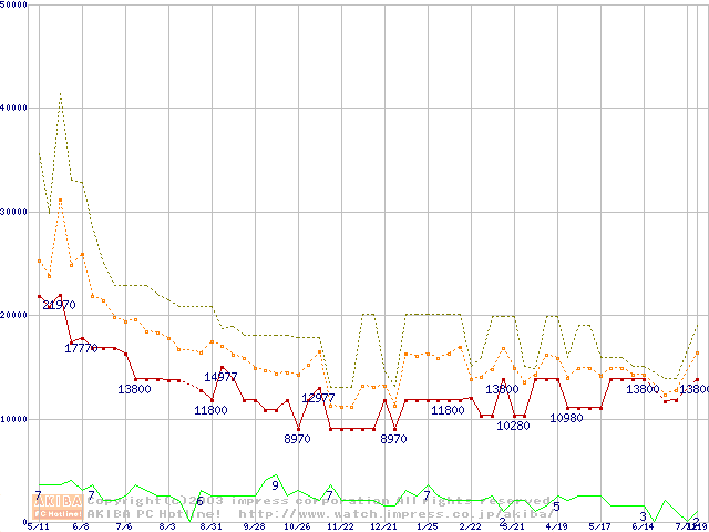 PC133 SDRAM DIMM CasLatency=3 ECC対応 Registeredタイプの最安値推移