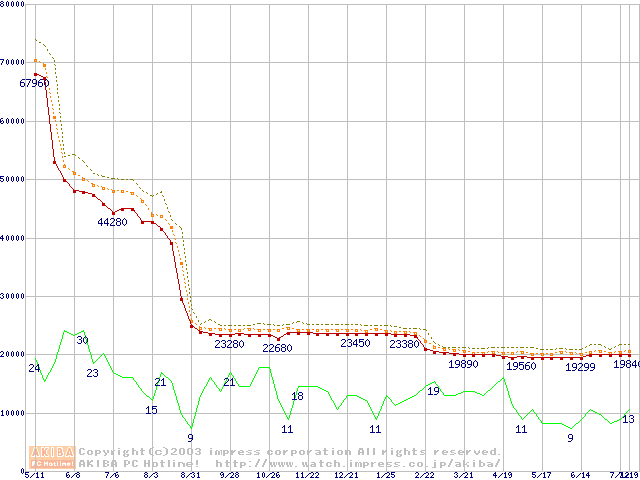 Socket 478 (micro-PGA,FSB 400MHz,L2 512KB,Northwood)の最安値推移