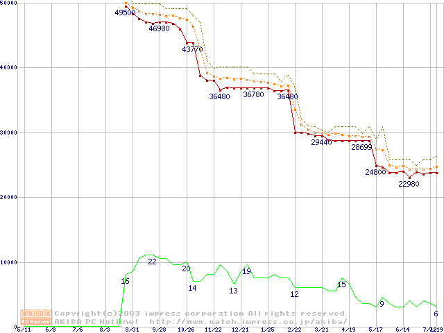 Socket 478 (micro-PGA,FSB 400MHz,L2 512KB,Northwood)の最安値推移
