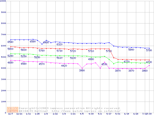 | [↑前グラフ]: | Socket 370 (FC-PGA,FSB 133MHz,L2 256KB,Coppermine)の最安値推移 |