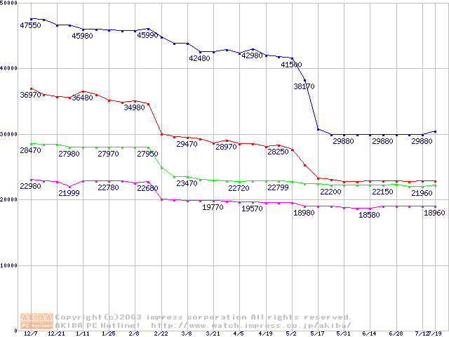 | [↑前グラフ]: | Socket 478 (micro-PGA,FSB 533MHz,L2 512KB,Hyper-Threading,Northwood)の最安値推移 |