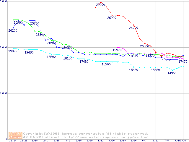 | [↓次グラフ]: | 2.5インチHDD主要製品(最安値2万円~3万円未満)の最安値推移 |