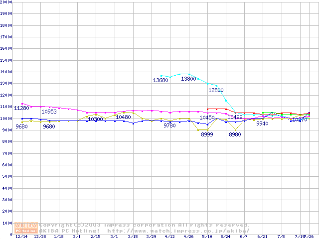 | [↑前グラフ]: | 2.5インチHDD主要製品(最安値3万円以上)の最安値推移 |