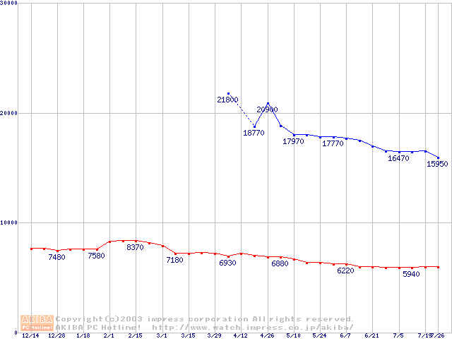 | [↓次グラフ]: | HDD 40GB~50GB未満(7200rpmクラス)の最安値推移 |