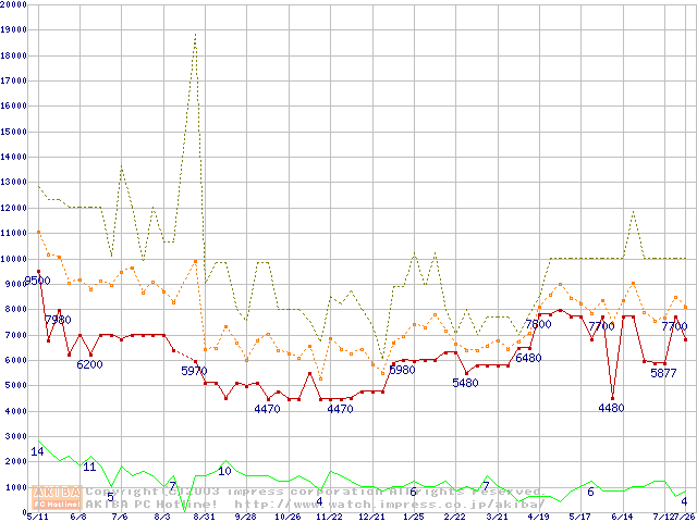 PC133 SDRAM DIMM CasLatency=3 ECC対応の最安値推移
