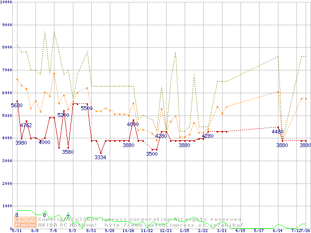 PC100 SDRAM DIMM CasLatency=2 ECC対応の最安値推移