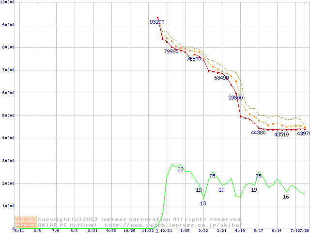 Socket 478 (micro-PGA,FSB 533MHz,L2 512KB,Hyper-Threading,Northwood)の最安値推移